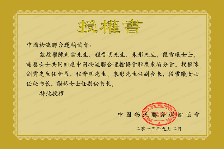 中国物流联合运输协会广东分会授权书